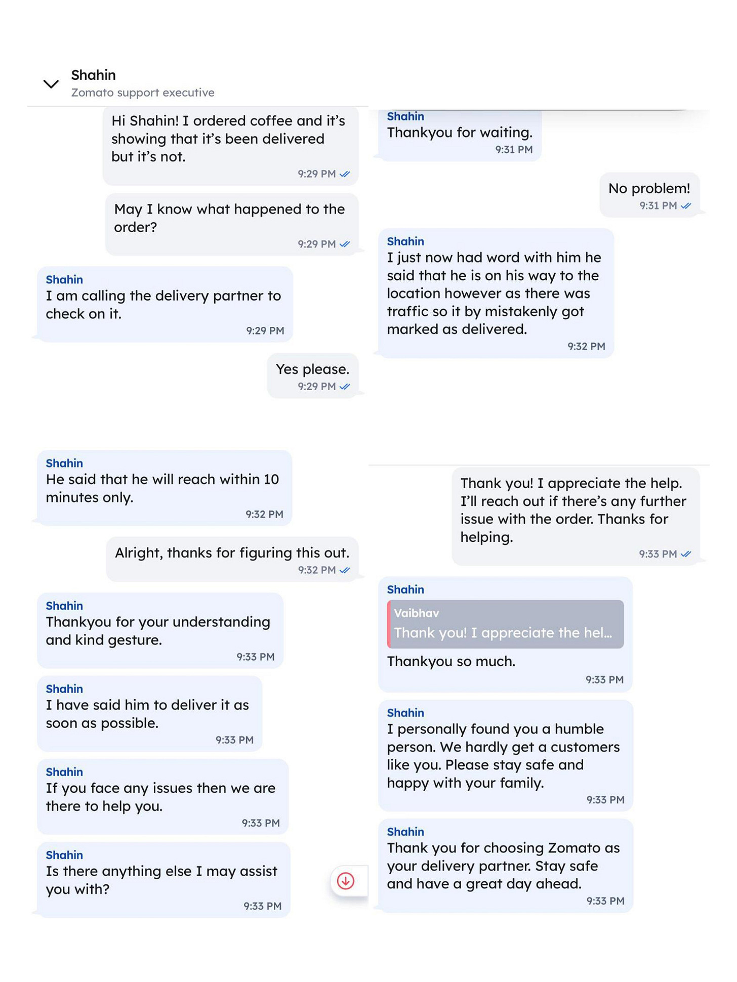 Anyway, the support person said the delivery guy should arrive in about ten minutes, so I said thank you. He was again flattered for some reason. We waited for the next 15-20 minutes, and there was no sign of the delivery guy, so I called him to check up. He said he was just around the locality and would be there in about 10 minutes and that he was stuck in traffic and had to go around because of some roadblock. We waited another 15 minutes before calling him again. He says that he's at the entrance of the building and that he'll reach in less than 5 minutes. Yet again, we waited another 8 minutes, after which he was no longer found; he didn't pick up our calls or deliver the coffee.